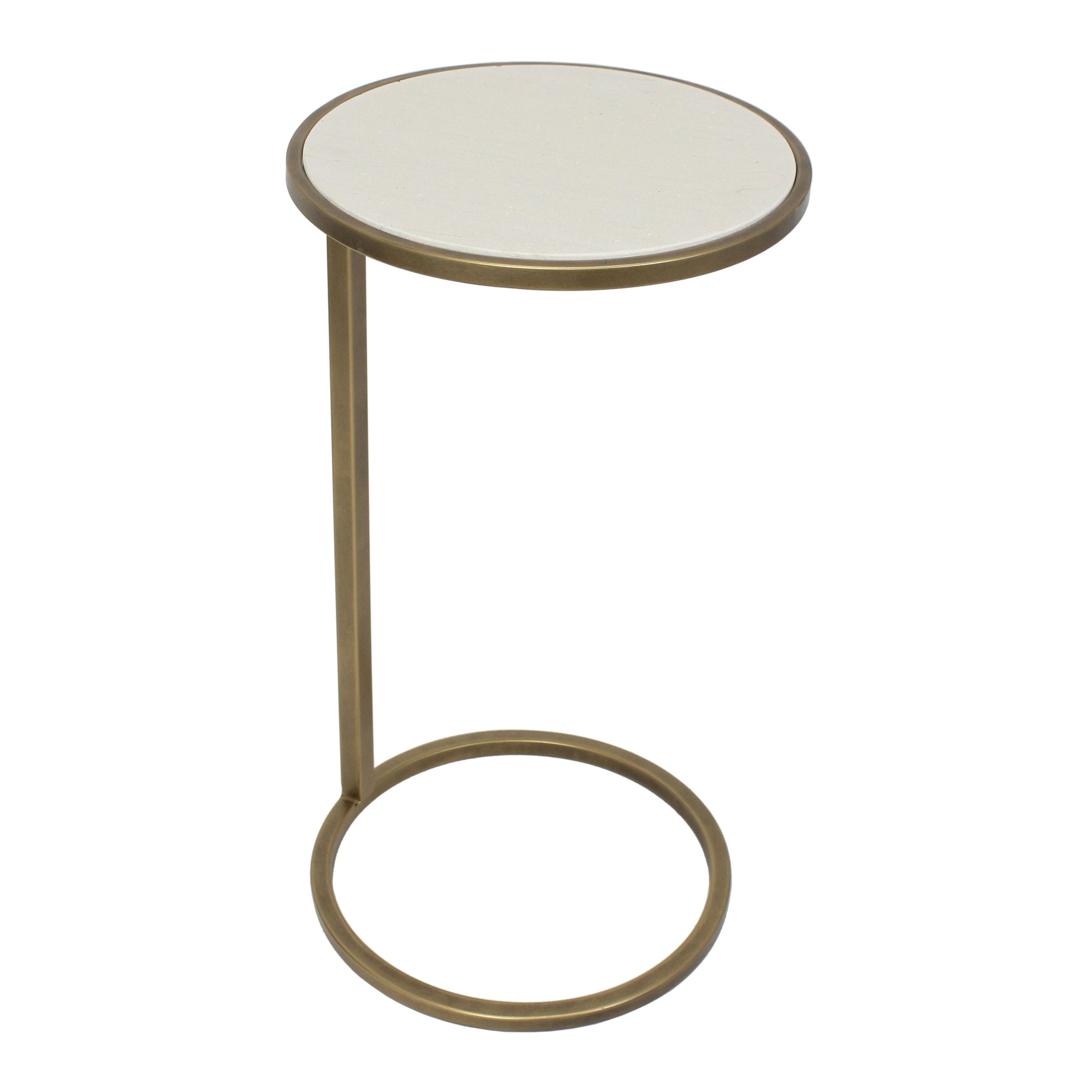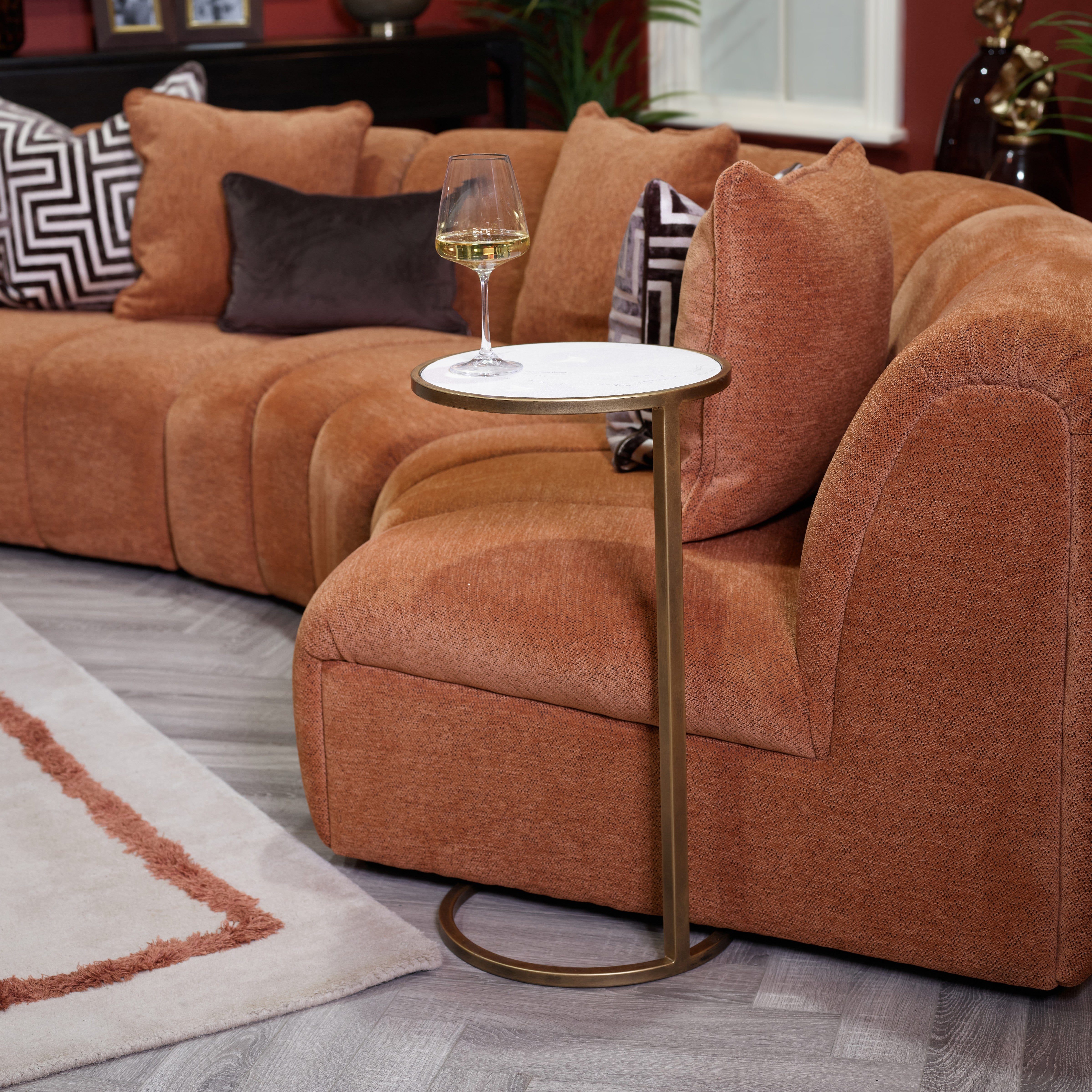 The Oscar Table in white is a refined round sofa table featuring a white marble top that brings a light, airy feel. The brass base adds warmth and contrast, creating an elegant balance of materials.