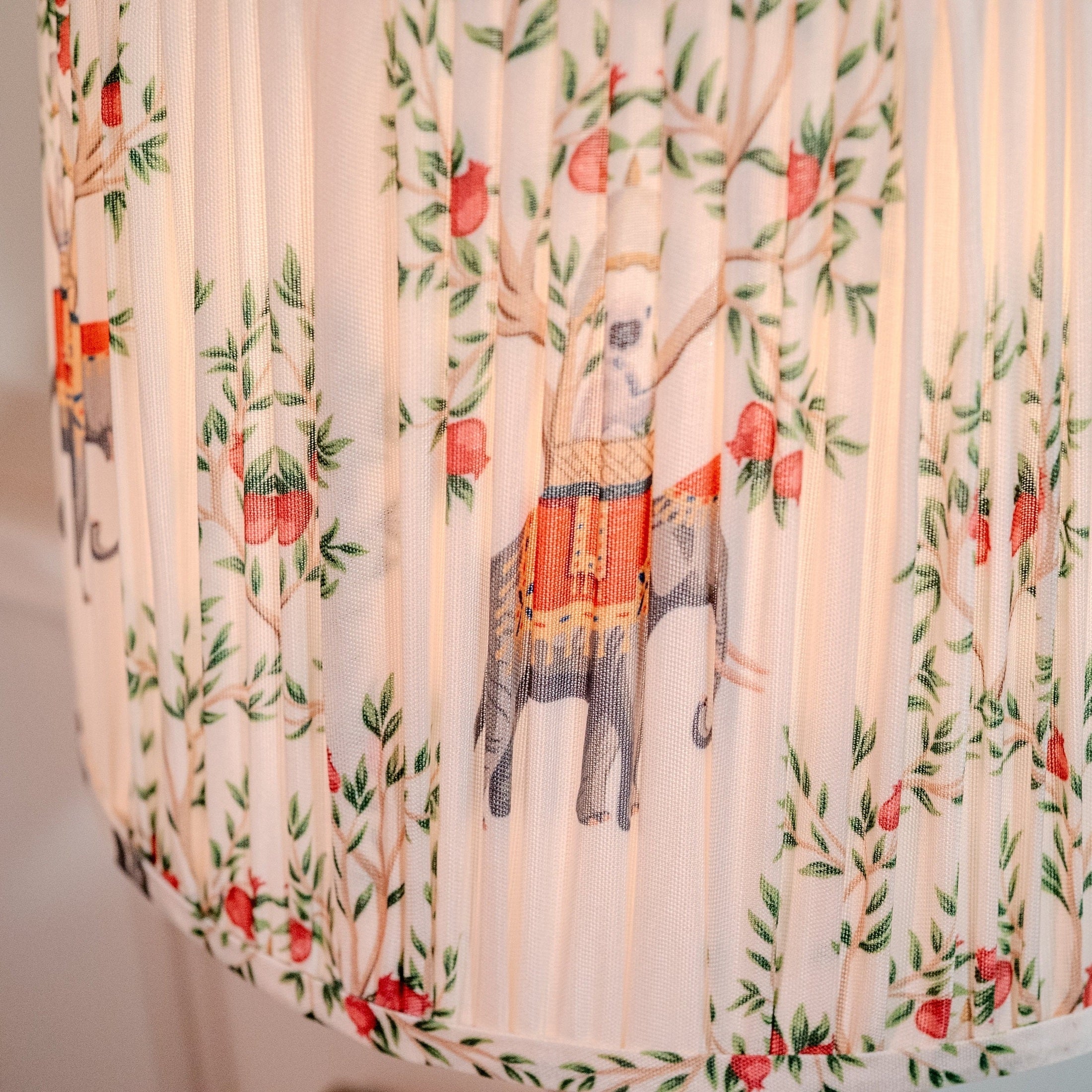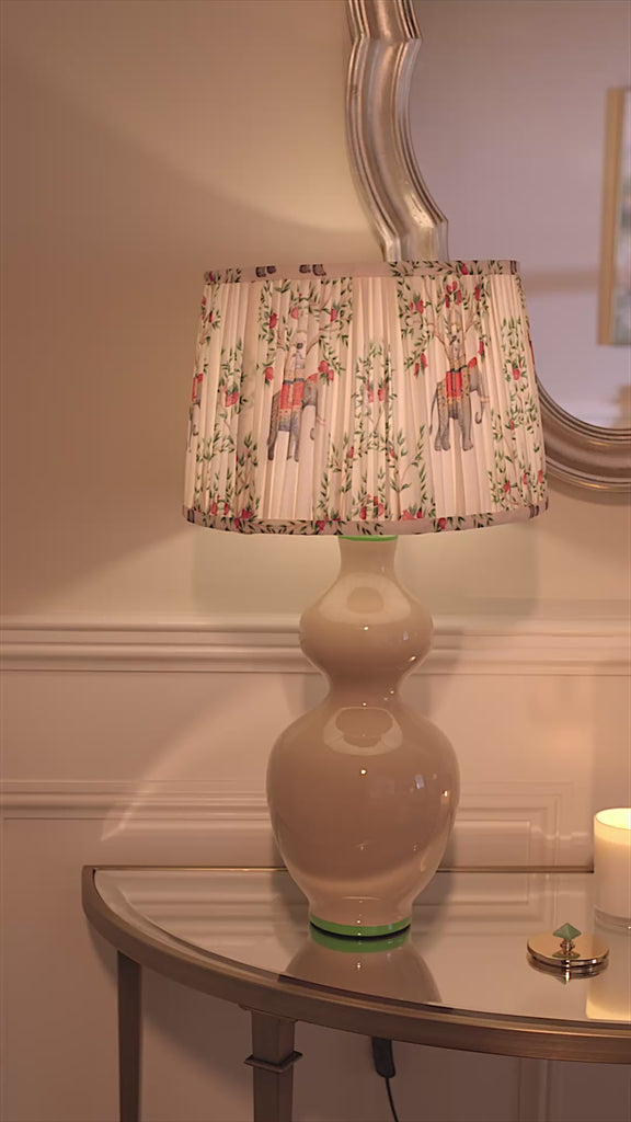 Say hello to your new conversation starter! This delightfully quirky table lamp pairs a curvy, sculptural base in soft cream with playful pops of green and a pleated lampshade featuring colorful, parading elephants amidst floral vines.