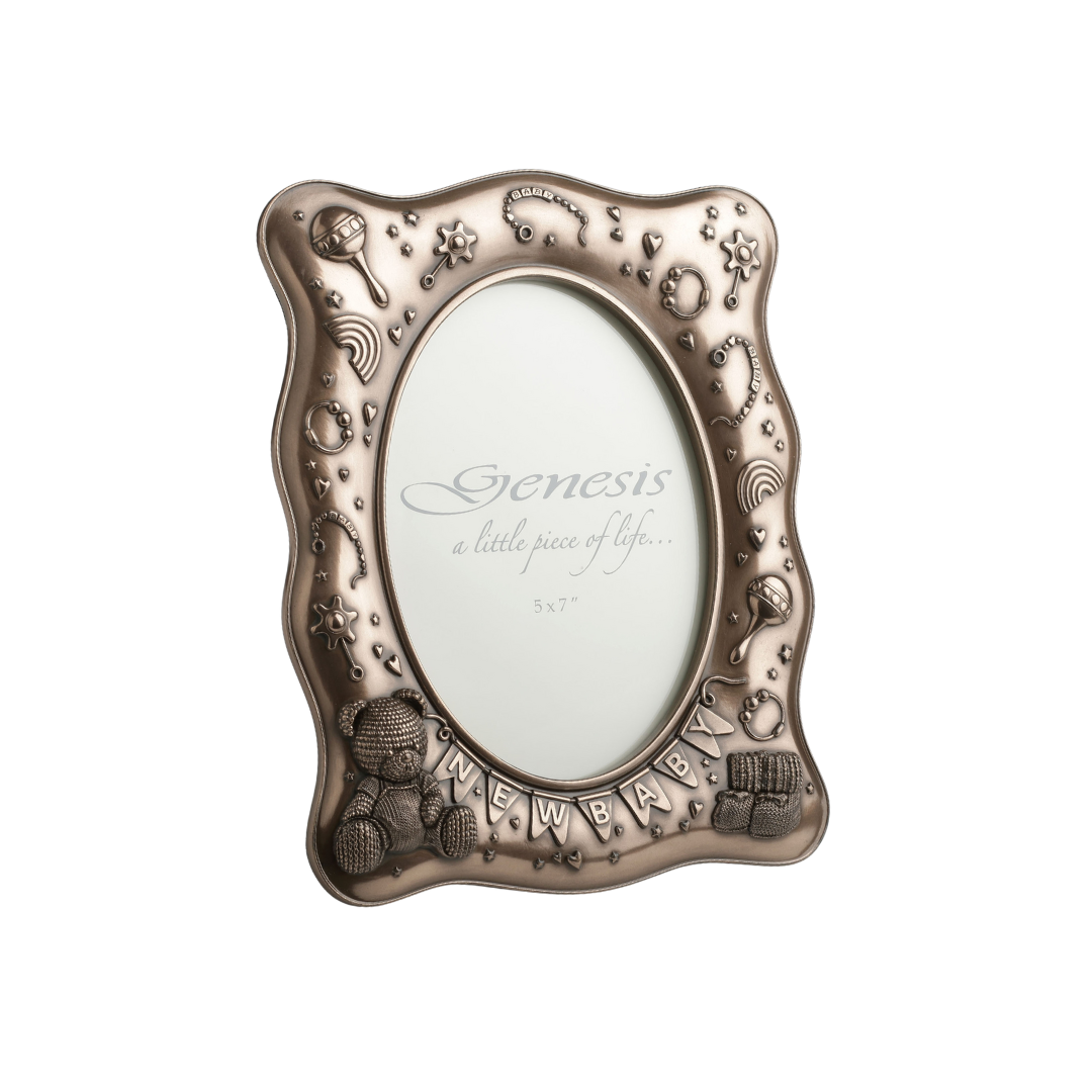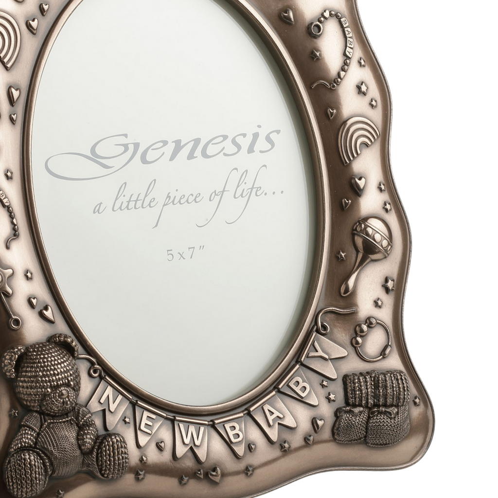 Celebrate the arrival of a little one with this charming Genesis New Baby Photo Frame, designed to hold a treasured 5x7" photo. The frame features delightful 3D baby-themed embellishments including a teddy bear, rattle, pacifier, and booties surrounding the border. The bottom banner reads “NEW BABY,” making it a heartwarming gift for new parents, baby showers, or christenings.